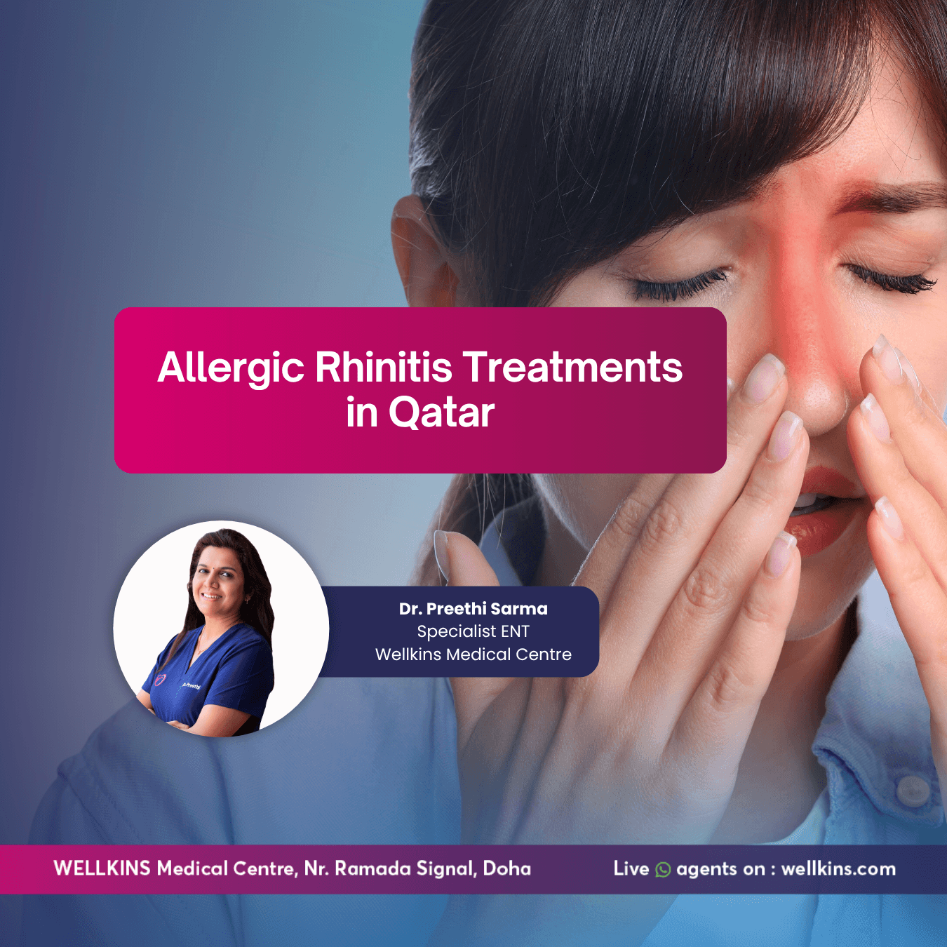 At Wellkins Medical Centre. We provide complete nasal allergy assessments, targeted allergen testing and personalized treatment plans that address not just the symptoms but the underlying sensitizations driving them. Whether you have been managing nasal allergy for years or are experiencing persistent symptoms for the first time, a specialist consultation will give you clarity, a precise diagnosis and a treatment approach designed specifically for life in Qatar.