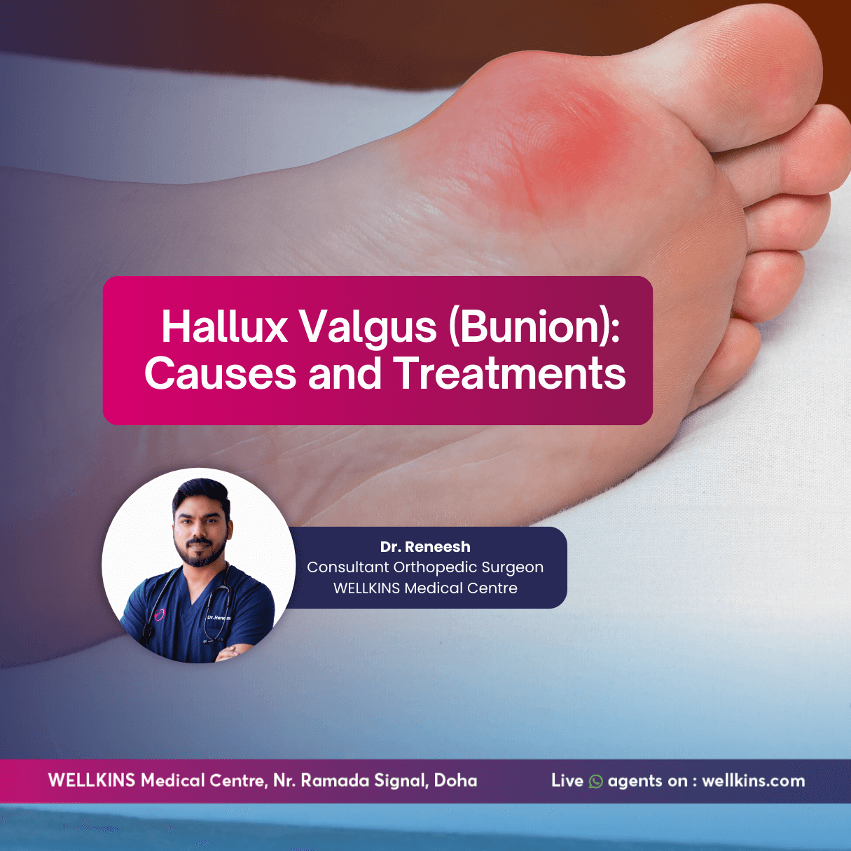 Hallux valgus is a common and often progressive forefoot deformity with both functional and biomechanical implications. It is more than a cosmetic concern; it is a structural issue that can change the way you move through the world. From an orthopedic surgeon’s perspective, early diagnosis, patient education and individualized treatment planning are key to achieving optimal outcomes. At Wellkins Medical Centre, we are dedicated to helping you walk without pain. Whether you need a simple orthotic adjustment or a surgical consultation, our team is here to support your journey back to healthy feet.