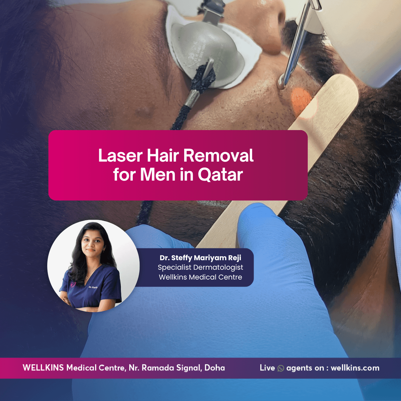 At Wellkins Medical Centre, Dr. Steffy Mariyam Reji and the dermatology team provide comprehensive laser hair removal consultations and treatments tailored to male patients. From the initial skin assessment through to the final session, every step is managed by a qualified specialist using technology appropriate for Qatar’s diverse patient population.